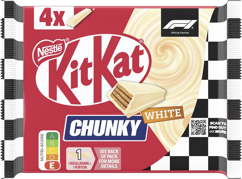 Die unverbindliche Preisempfehlung für den KITKAT Chunky FORMEL 1 Multipack (4 x 40g) liegt bei 3,19 Euro.