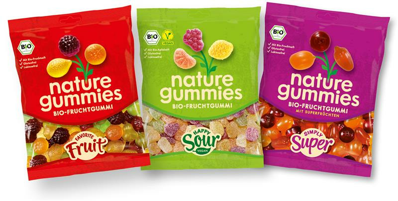 Die Bio-zertifizierten nature gummies im 120 g Beutel werden mit Bio-Fruchtsaft und ohne jegliche Geschmacksverstärker oder künstliche Zusatzstoffe hergestellt. Das leckere Trio gibt es im Lebensmitteleinzelhandel (Müller und Tegut) und im ausgewählten Bio-Fachhandel.