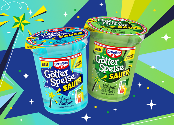 Mit der Special Edition Götterspeise „sauer“ bedient Dr. Oetker den Trend von sauren Produkten, den man in verschiedensten Produktkategorien im Lebensmitteleinzelhandel beobachten kann, und bietet damit ein spritziges, fruchtiges und zugleich herrlich saures Geschmackserlebnis in zwei kreativen Sorten. In hellen, leuchtenden Farben und mit einem aufmerksamkeitsstarken Verpackungs-Design ziehen die magischen Sorten Blauer Zauber mit Erdbeer-Geschmack und Grüner Zauber mit Apfel-Geschmack alle Blicke auf sich und bringen eine kreative Innovation ins Kühlregal. Mit der Kombination aus auffälligen Farben und ausgefallenem Geschmack sorgt diese Special Edition somit für ein besonderes Verzehrerlebnis.